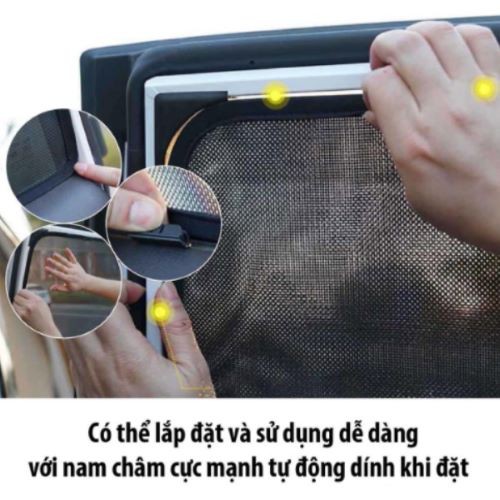 – Sử dụng dễ dàng bằng cách đưa rèm lên sát mặt kính xe ướm thử, sau đó gắn chốt giữ rèm cố định chặt trên khung dưới cánh cửa, mỗi cửa dùng 2 chốt gần phía đầu và phía cuối của rèm, kết hợp với một chốt ở viền trên của cánh cửa, tạo thành hình tam giác để giữ rèm.