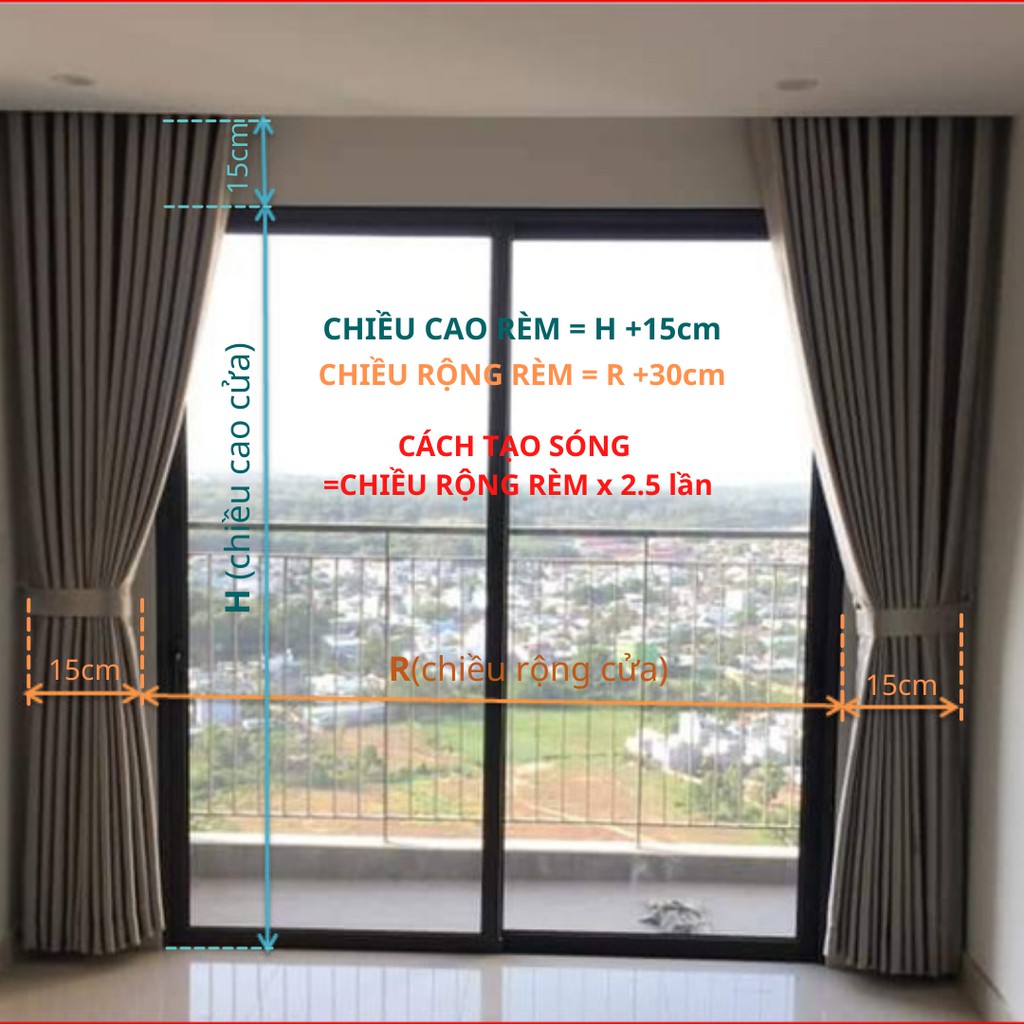 Shop bán theo kích thước trải thẳng khi treo lên sẽ gấp nếp lại để tạo sóng do vậy khi treo lên rèm sẽ nhún lại còn 1 nửa ( VD: rèm rộng 2m treo lên sẽ còn tối đa 1.2m. nên đặt mua rèm cửa có chiều rộng gấp từ 2.2-2,5 lần so với độ rộng cửa để có độ nhún đẹp nhất, độ nhún như hình shop đăng là 2,5 lần)