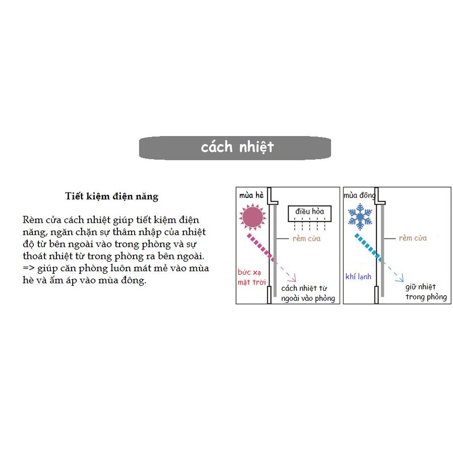 Việc sử dụng rèm có tác dụng cách nhiệt vào mùa hè và mùa đông, ngăn không để nhiệt độ trong phòng thoát ra ngoài và ngược lại. Hiệu quả làm mát và sưởi ấm cũng được cải thiện, tiết kiệm điện và tiết kiệm năng lượng, làm cho căn phòng dễ chịu hơn.