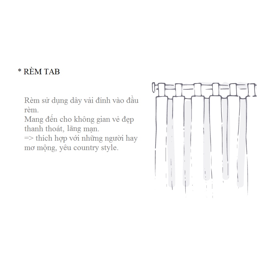 Vải voan cao cấp, được nhập khẩu trực tiếp từ Nhật Bản.Rèm tab (rèm dây) là mẫu rèm mang đến cho không gian một vẻ đẹp thanh thoát và lãng mạng, thích hợp với những người hay mộng mơ, yêu country style.