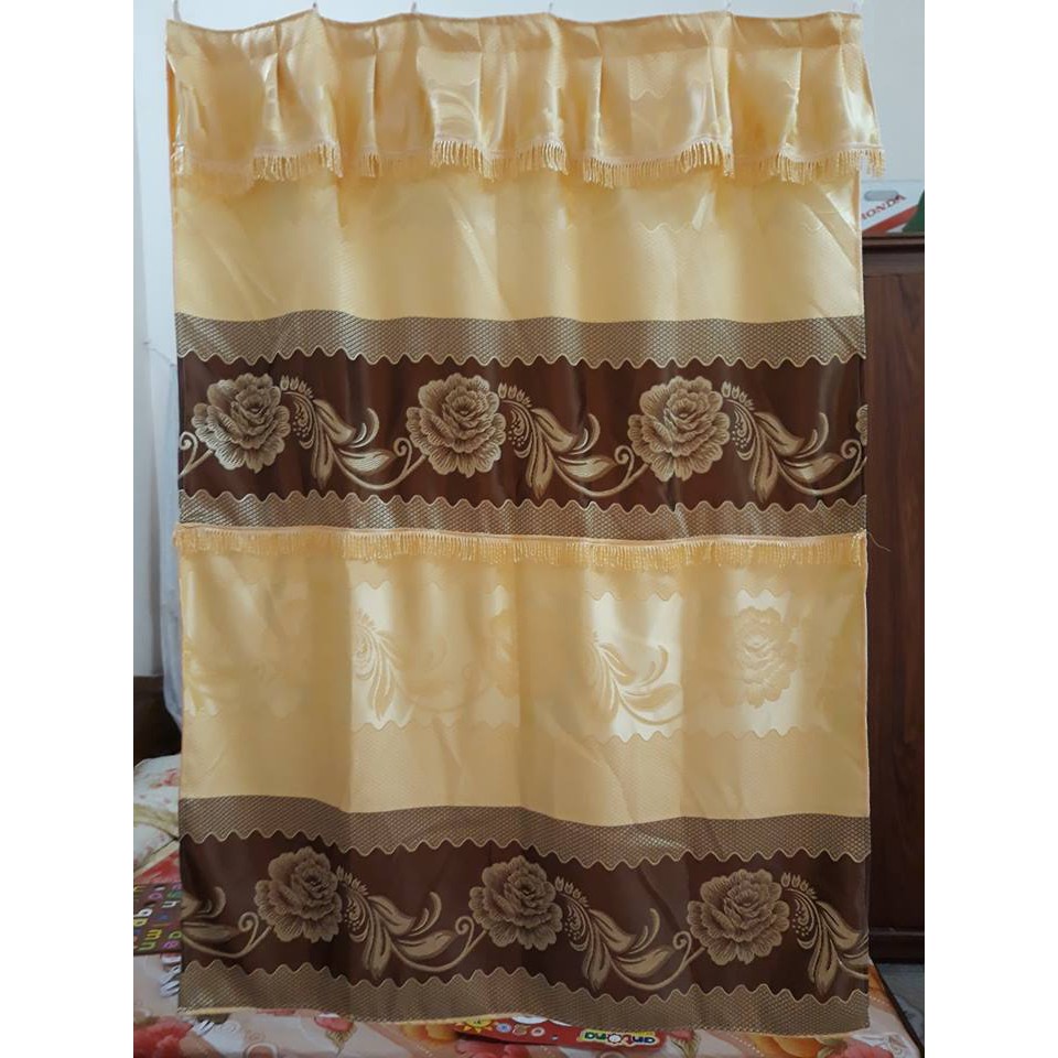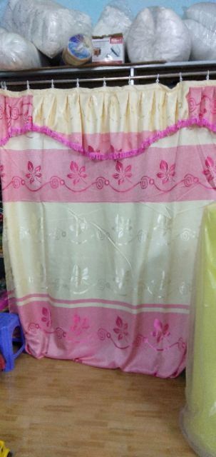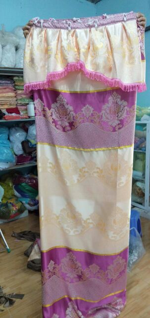 Vải gấm bóng in hoa, gấm sao.Riềm trên xếp ly, căng phẳng,khách muốn có độ nhún nhiều thì đặt gấp đôi