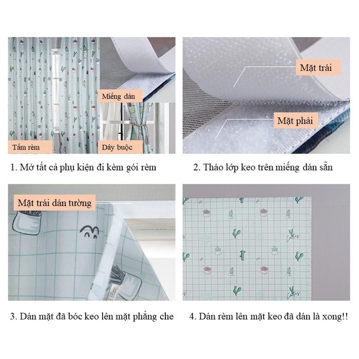 ❌HDSD: Dán 1 lớp keo cố định vào tường, trên rèm có 1 miếng keo đã gắn cố định trên rèm. Dùng keo này dán chặt vào keo trên tường, nếu muốn rèm căng ngang thì mua rèm vừa khít với số đo cửa. Khuyến khích mua độ ngang và dài của rèm dài hơn 20-30cm để dư có thể nhún rèm phồng xinh hơn nha bạn nhé.
