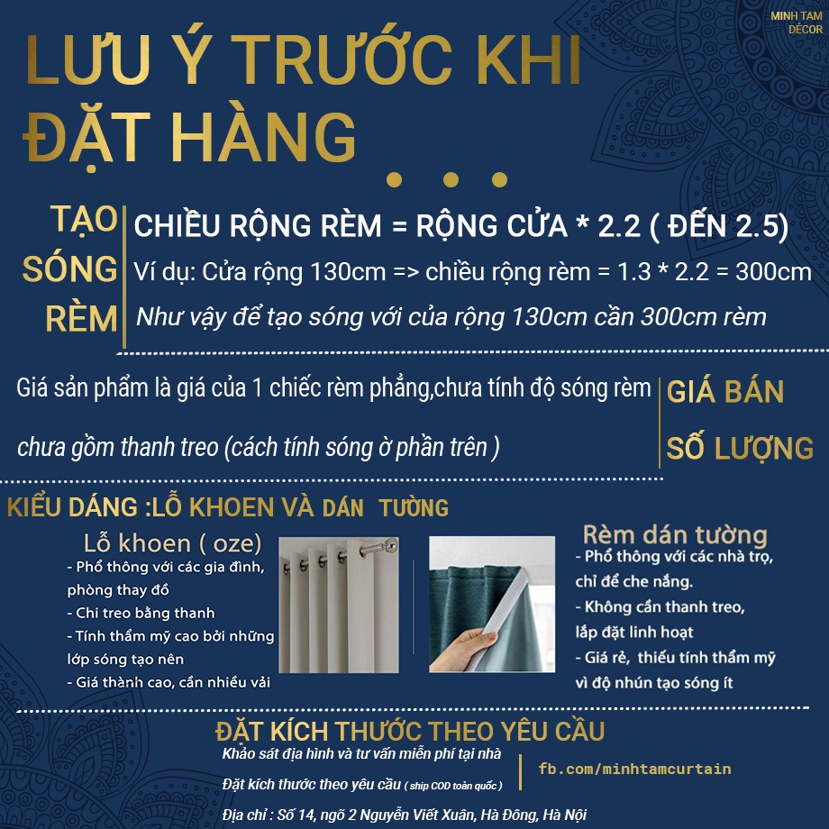 ( ví dụ cửa nhà bạn kích thước - rộng – 1m, dài 1.4m => nên chọn rèm : rộng 2m , dài 1,8 ( tùy vào nhu cầu của bạn muốn rèm dài đến đâu. Thông thường cách đất 5cm là đẹp) )