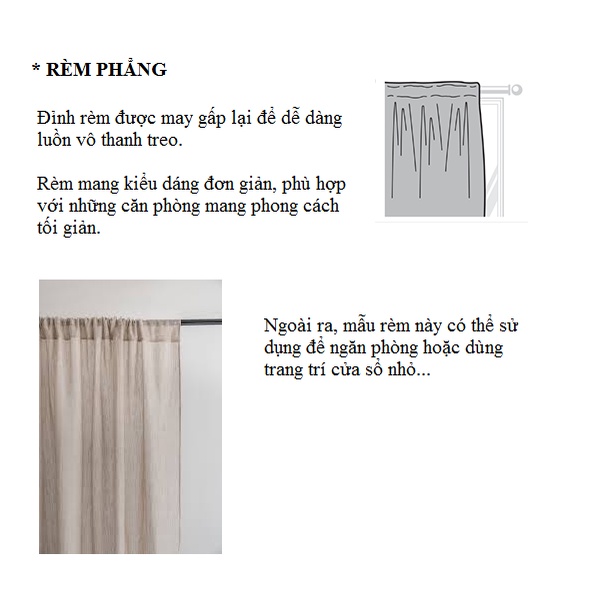 Mẫu rèm mang kiểu dáng đơn giản, phù hợp với căn phòng mang phong cách tối giản. Đặc biệt, rèm có thể sử dụng ngăn phòng hoặc trang trí kệ bếp, cửa sổ nhỏ.Kích thước rèm là kích thước căng thẳng, nếu muốn tạo sóng rèm bạn cần rèm có chiều ngang lớn hơn 2 lần kích thước muốn che phủ.