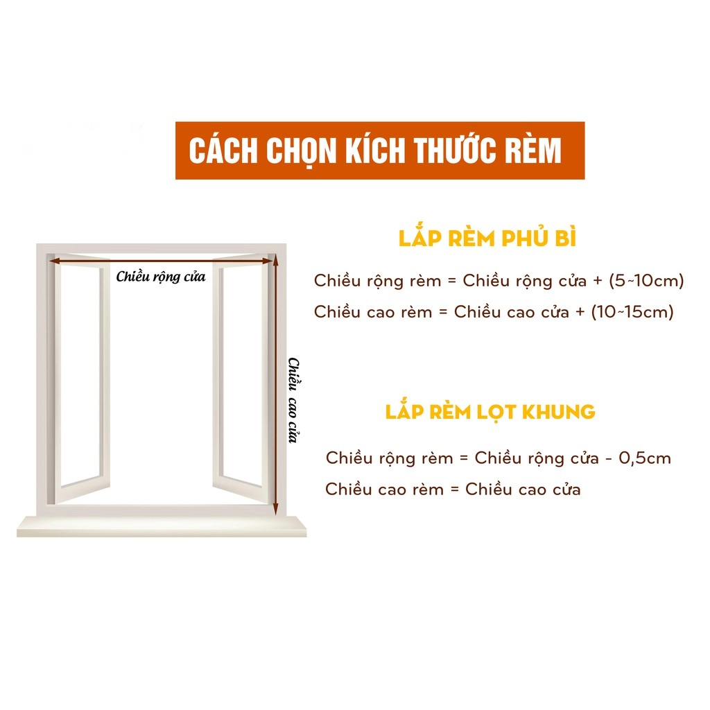 + Trường hợp phủ ngoài phải cộng thêm 10cm và cao 10cm thì chúng ta được kích thước rèm phù hợp là rộng 1.1m x cao 1.30m