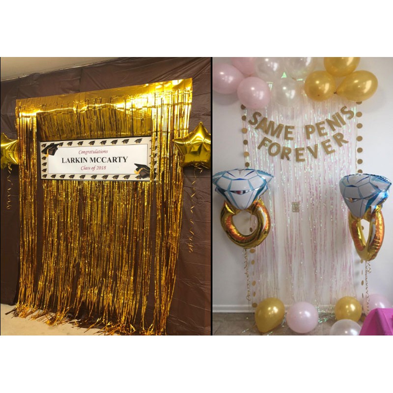Rèm trang trí là một phụ kiện background trang trí với giá thành cực rẻ sẽ giúp bạn trở thành một nhà trang trí chuyên nghiệp với cách dùng siêu dễ cùng với các bong bóng chữ hoặc những bong bóng trang trí bữa tiệc.Siêu phẩm mới 2019 với rèm siêu nhũ mang lại cảm giác mới lạ hơn cho các bữa tiệc.