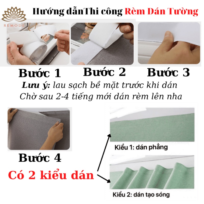 - Rèm đã may hoàn thiện, treo lên thanh rèm hoặc dây cố định, rèm dán tường có sẵn miếng dán , dán lên là dùng được ngay.