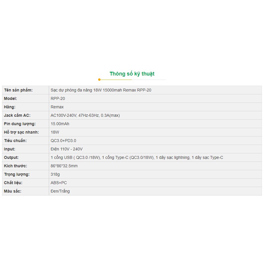- Output: 1 cổng USB ( QC3.0 /18W), 1 cổng Type-C (QC3.0/18W), 1 dây sạc lightning, 1 dây sạc Type-C