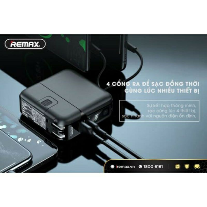 Pin sạc dự phòng REMAX có 2 cổng ra sạc với 1 cổng USB QC3.0 và 1 cổng Type-C PD3.0 cho khả năng sạc nhanh 2 thiết bị cùng lúc mà vẫn an toàn và không gây ảnh hưởng lẫn nhau.
