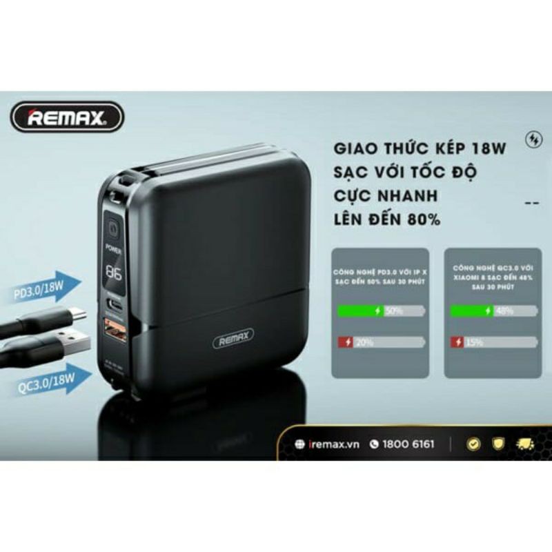 Củ sạc kiêm pin sạc dự phòng REMAX 2in1 được trang bị công nghệ sạc nhanh PD3.0 và QC3.0 giúp sạc nhanh siêu tốc cho nhiều thiết bi từ smartphone, tablet đến laptop. Mang lại nhiều tiện ích khi sử dụng.