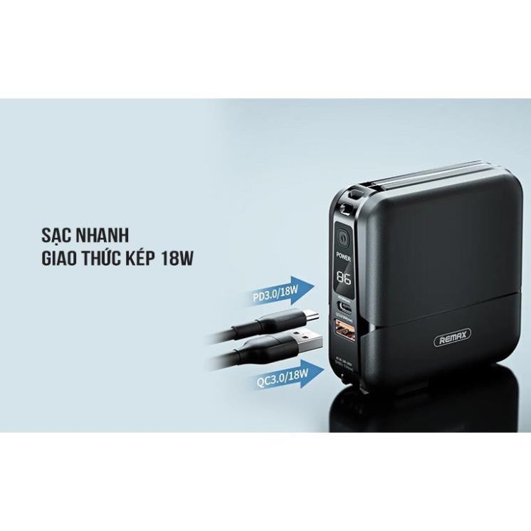 Củ sạc kiêm pin sạc dự phòng Remax có đầu ra cổng kép USB và đầu Type-C, tương thích với nhiều thiết bị. Ở chế độ pin dự phòng và chế độ củ sạc có 2 dây sạc chân cắm lightning và Type-C thuận tiên khi sạc mà không lo đến dây sạc.