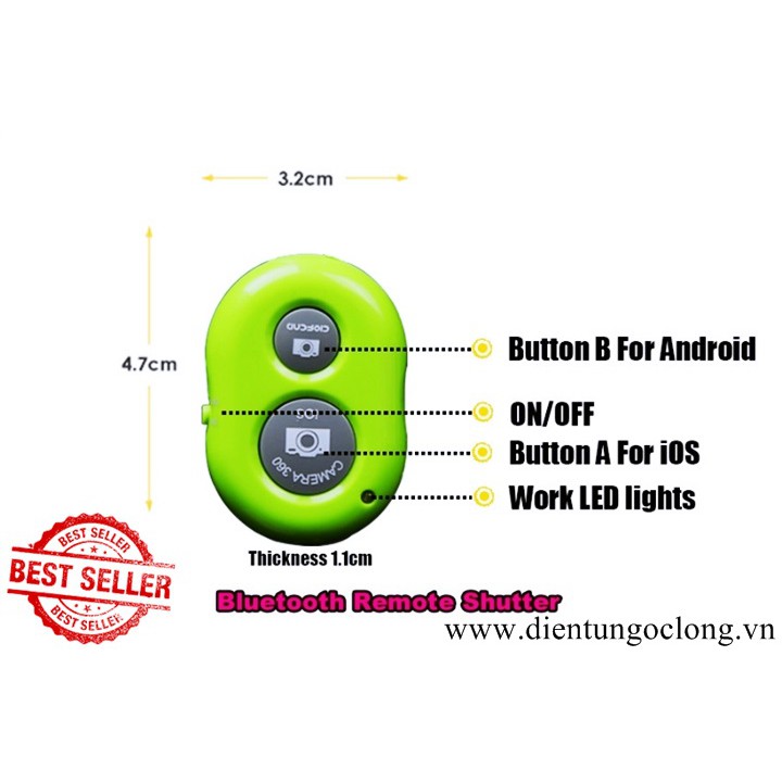 Remote chụp ảnh cho điện thoại Bluetooth ShutterKết nối bluetooth tầm xa 10m. 2 nút hoạt động cho iOS và Android. Kết nối nhanh và dễ dàng sử dụng. Nhỏ gọn tiện dụng ở mọi nơi. Pin có khả năng thay thế. Màu sắc đa dạng trẻ trung.