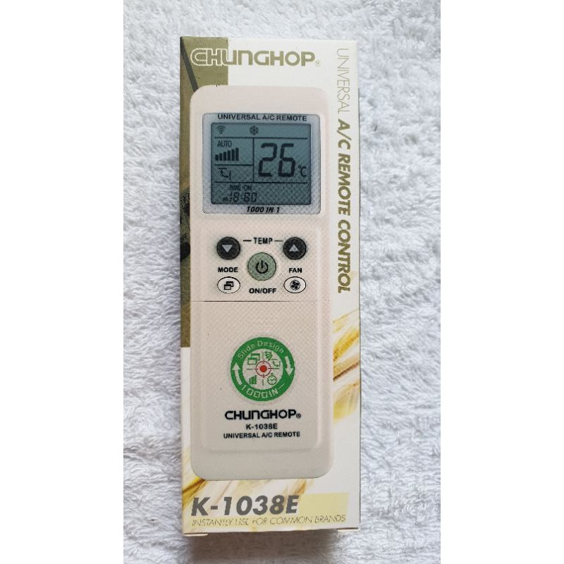 CHUNGHOP ĐA NĂNG K1038E là dòng điều khiển đa năng đời mới nhất trên thị trường hiện nay.K1038 E tích hợp tần số của hơn 1000 sản phẩm trên thị trường từ dòng cao cấp như: Míthubishi, Panasonic, Toshiba, LG đến các dòng phổ Thông MIDEA, GREE, Carrier, Haier ☑️ Màn hình LCD lớn, bàn phím mềm hiển thị tất cả các chức năng Thông thường, ngoài ra CHUNGHOP công tích hợp đồng hồ điện tử và đèn pin chuyên dùng ban đêm ☑️ nhỏ gon nên dễ cầm ☑️ sử dụng pin AAA nên tiết kiệm điện năng.1 đôi pin sử dụng cả năm Liên hệ để có giá bán buôn tốt hơn.Giá WWDOGE