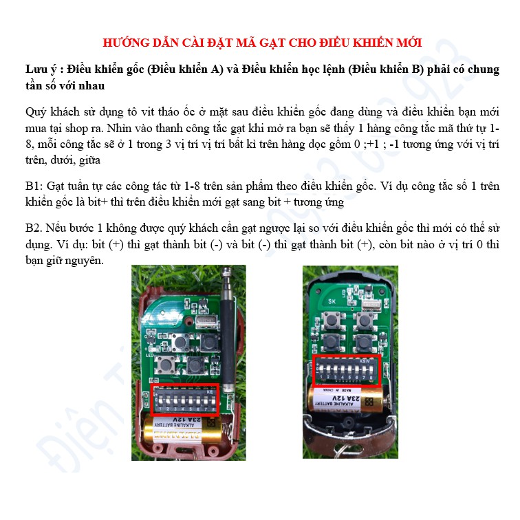 Quý khách sử dụng tô vit tháo ốc ở mặt sau điều khiển gốc đang dùng và điều khiển bạn mới mua tại shop ra. Nhìn vào thanh công tắc gạt khi mở ra bạn sẽ thấy 1 hàng công tắc mã thứ tự 1-8, mỗi công tắc sẽ ở 1 trong 3 vị trí vị trí bất kì trên hàng dọc gồm 0 ;+1 ; -1 tương ứng với vị trí trên, dưới, giữa