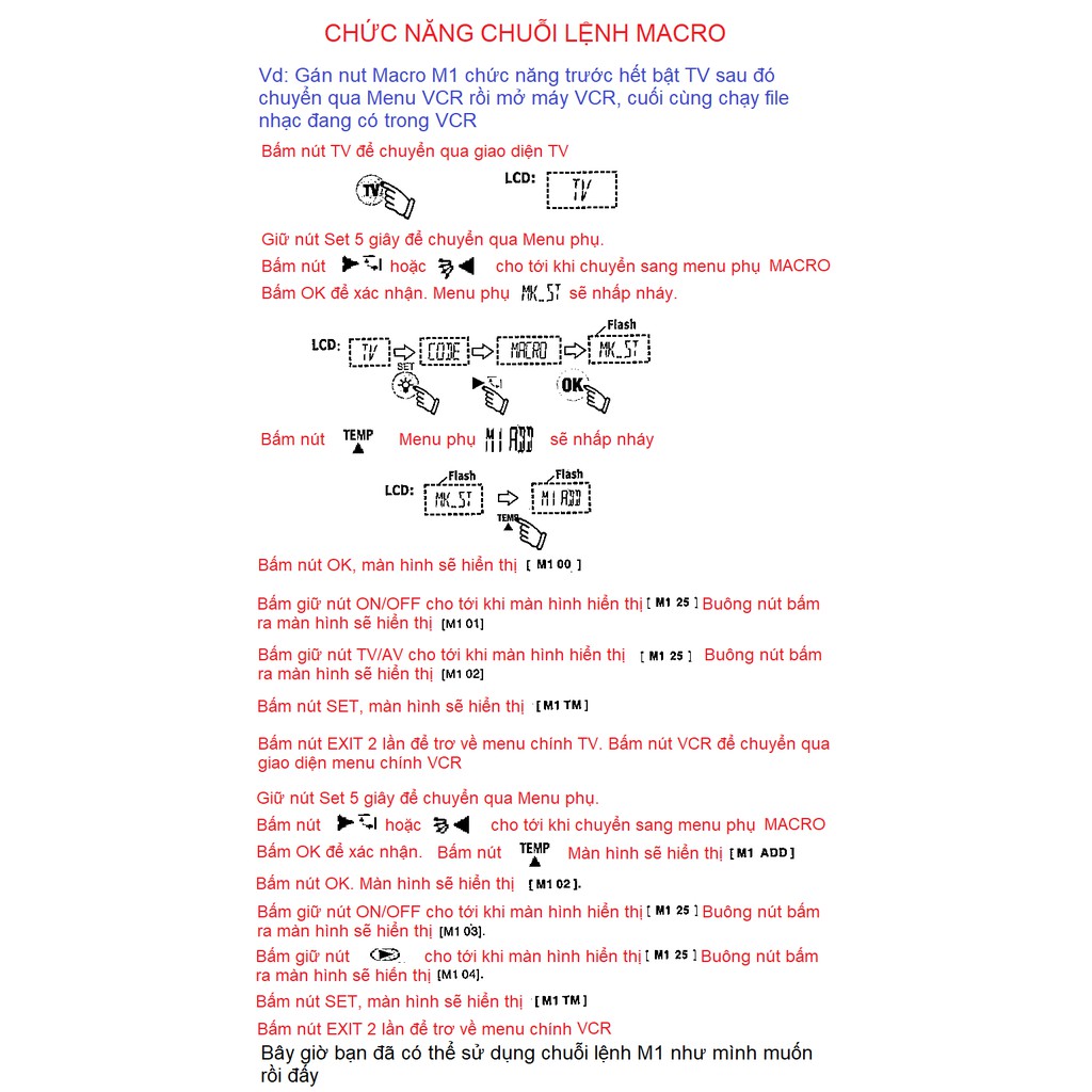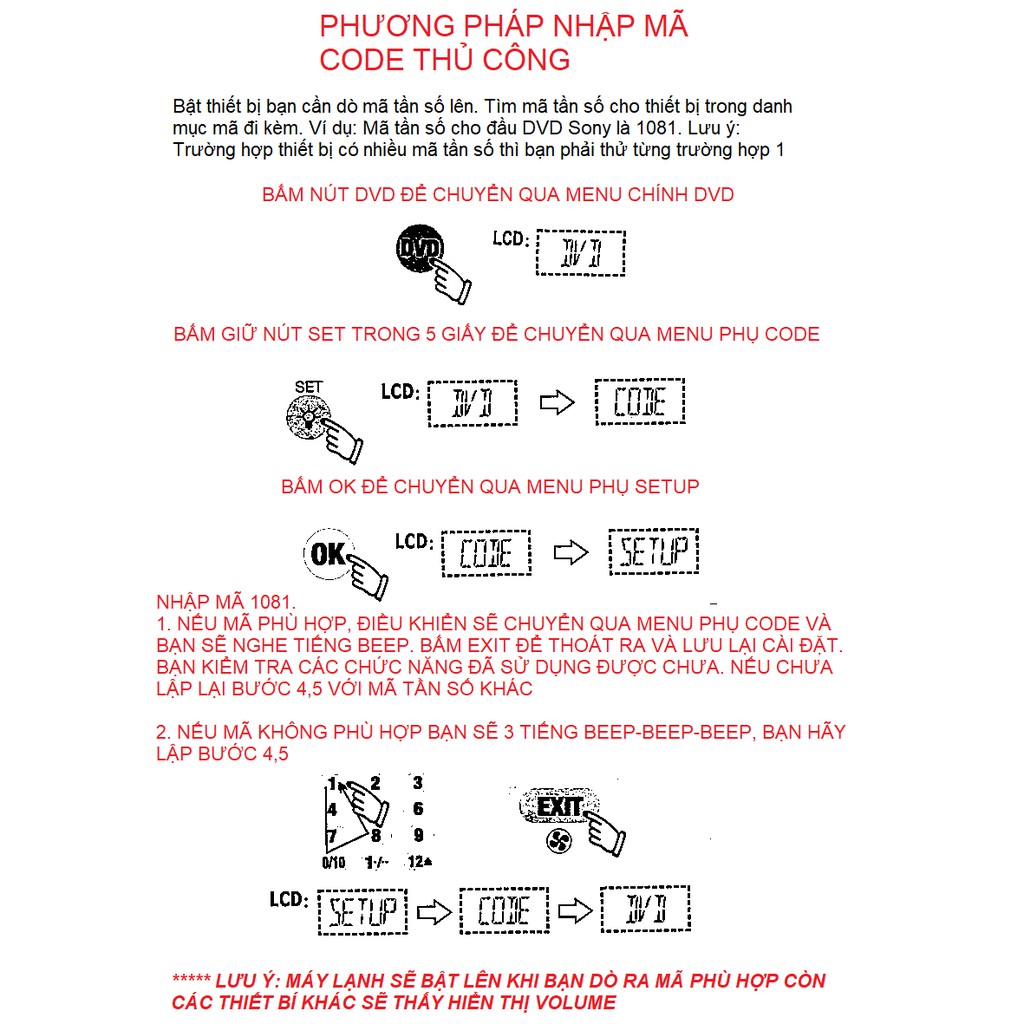 SIÊU ĐA NĂNG: RM-991 được tích hợp hơn 10000 mã tần số các thiết bị TV, đầu đọc đĩa, máy lạnh... của tất cả các thương hiệu được sản tại các nước và năm sản xuất khác nhau. Bạn có thể dò mã tần số bằng nhiều phương pháp nhưng trong khuôn khổ của bài viết này, shop xin hướng dẫn bạn cách dò mã bằng nhập mã thủ công. Bạn có thể "vọc" các cách khác theo hướng dẫn đi kèm.