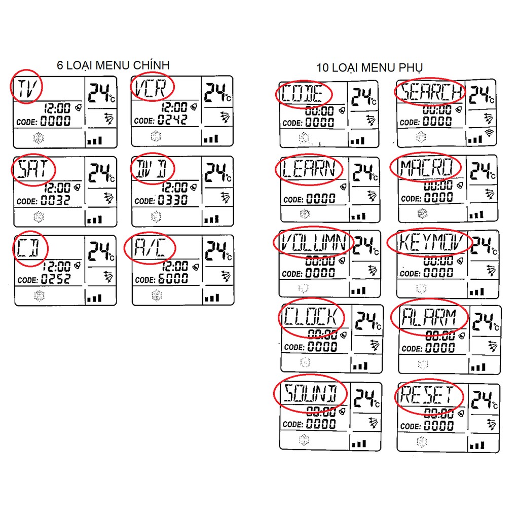 Trước khi đi chi tiết vào các tính năng, các bạn nên làm quen với giao diện của RM-991. Trên màn hình sẽ hiện thị các menu chính (6 loại: TV, VCR, SAT, DVD, CD, A/C) và 10 menu phụ (CODE, SEARCH, LEARN..)