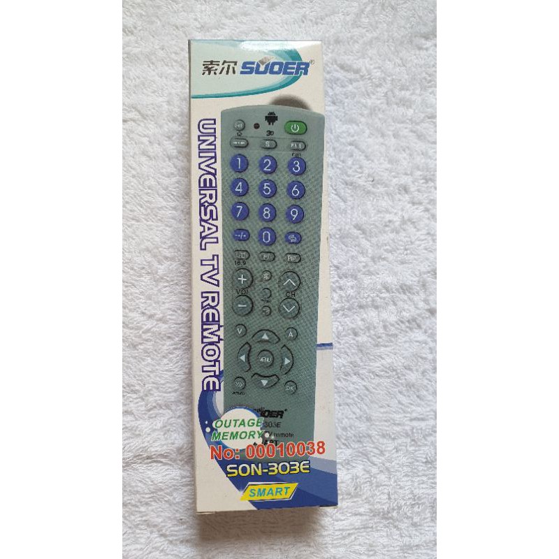 REMOTE ĐIỀU KHIỂN TIVI ĐA NĂNG SOUER SON-303E (HÀNG CHÍNH HÃNG) Tương thích 100% với các loại TV CRT, LED, LCD nhờ được tích hợp hàng ngàn code của các sản phẩm khác nhau. Hàng chính hãng, mới 100% có hộp sản phẩm đi kèm. Thiết kế đơn giản với vỏ cao su không chì an toàn và thân thiện với môi trường. Phím bấm êm tay. Có hướng dẫn sử dụng với tất cả code sản phẩm đang có trên thị trường. Khoảng cánh sử dụng tối ưu: 10m. Sử dụng 2 viên pin AAA.Giá XSOL