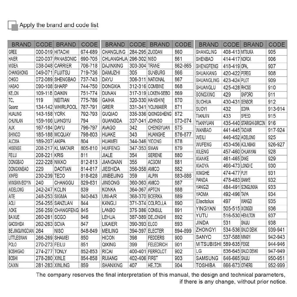 Lưu ý: nếu máy lạnh nhà mình không nằm trong bảng danh sách trên, khách hàng có thể dò tự động rà tần số bằng cách nhấn giữ phím lên hoặc xuống. Khi nào máy lạnh kêu tiếng "bip" hoặc "nháy đèn" thì biết máy lạnh đã nhận được tín hiệu và bấm "OK" để cố định mã và sử dụng.