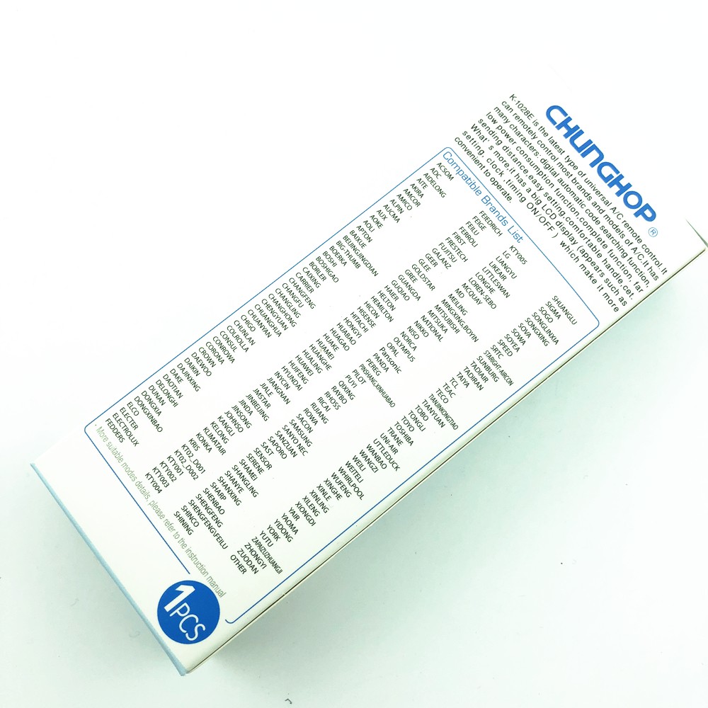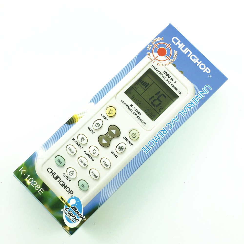 CHUNGHOP K-1028E là dòng remote máy lạnh đa năng đời mới tích hợp tần số của hơn 1000 dòng sản phẩm máy lạnh hiện có trên thị trường từ các dòng cao cấp như Mitsubishi, Panasonic, Toshiba, LG đến các dòng phổ thông: Midea, Gree, Carrier, Haier
