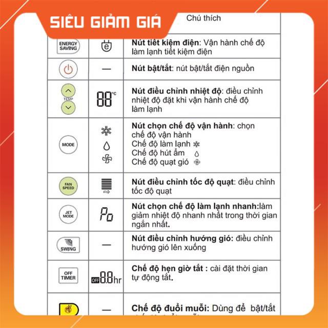 Chế độ vận hành tiết kiệm điện: bạn nhấn nút ENERGY SAVING, máy sẽ tự động tăng nhiệt độ phù hợp để giảm tối đa điện năng tiêu thụ. Nhiệt độ sẽ được đặt là 22 độ C nếu nhiệt độ phòng nhỏ hơn 22 độ C. Nếu nhiệt độ phòng lớn hơn, máy sẽ duy trì nhiệt độ hiện tại.
