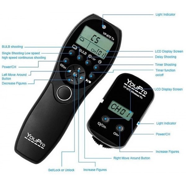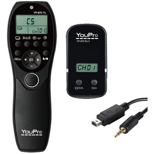 Remote Timelapse Youpro YP870 sử dụng tần số sóng 2.4 GHz, cho khả năng hoạt động ngoài trời lên đến hơn 100m. Youpro YP870 có đầy đủ các chức năng timelapse (Delay, Interval time, Long,...) có thể được điều khiển từ xa. Youpro YP870 có phạm hoạt động lên đến 100m.