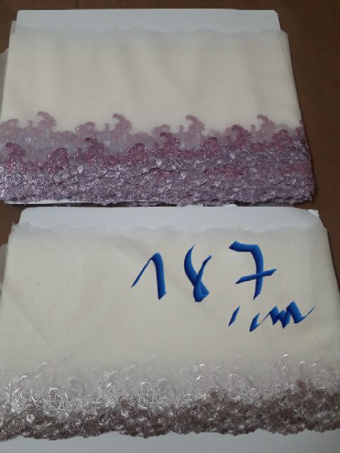 Ren dùng trang trí trong may mặc , làm handmade........ sp là ren thêu cao cấp trang trí váy đầm rất đẹp.@@ quy cách gói 1m. Shop có 2 màu tím và màu kem