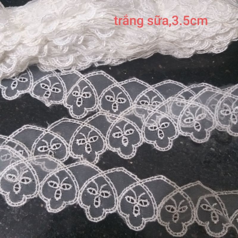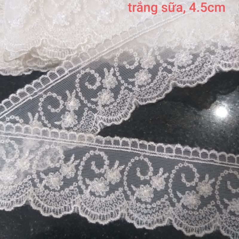 Ren lưới thêu trang trí , màu trắng sữa, size từ 2_6.5cm (dây 2m)