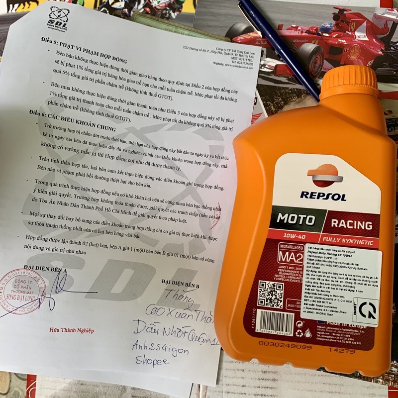 Sản phẩm nhập khẩu và phân phối bởi công ty Song Đại Long - Express Center. Mẫu Repsol Moto Racing 10W-40 sản xuất tại Châu Âu - Tây Ban Nha.⛔️ Lưu ý: Bài sản phẩm bán mẫu Nhớt Repsol Moto Racing 10W-40 Châu Âu, chai có vòi nhựa dài (mẫu Repsol Racing indonesia miệng chai làm seal nilong bạc).