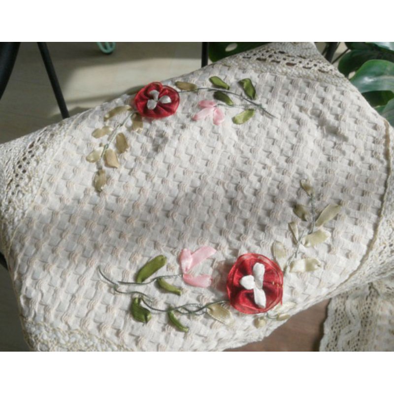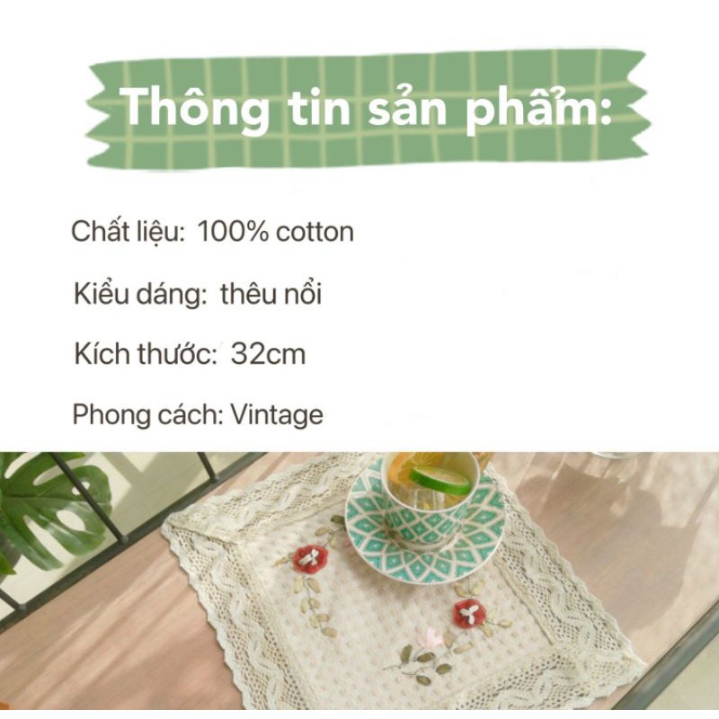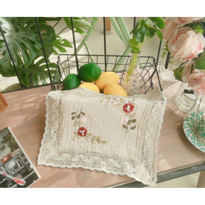 RH/Tấm lót ly cốc bình hoa thêu ruy băng Vintage trang trí phòng bếp decor phòng khách kiểu Âu