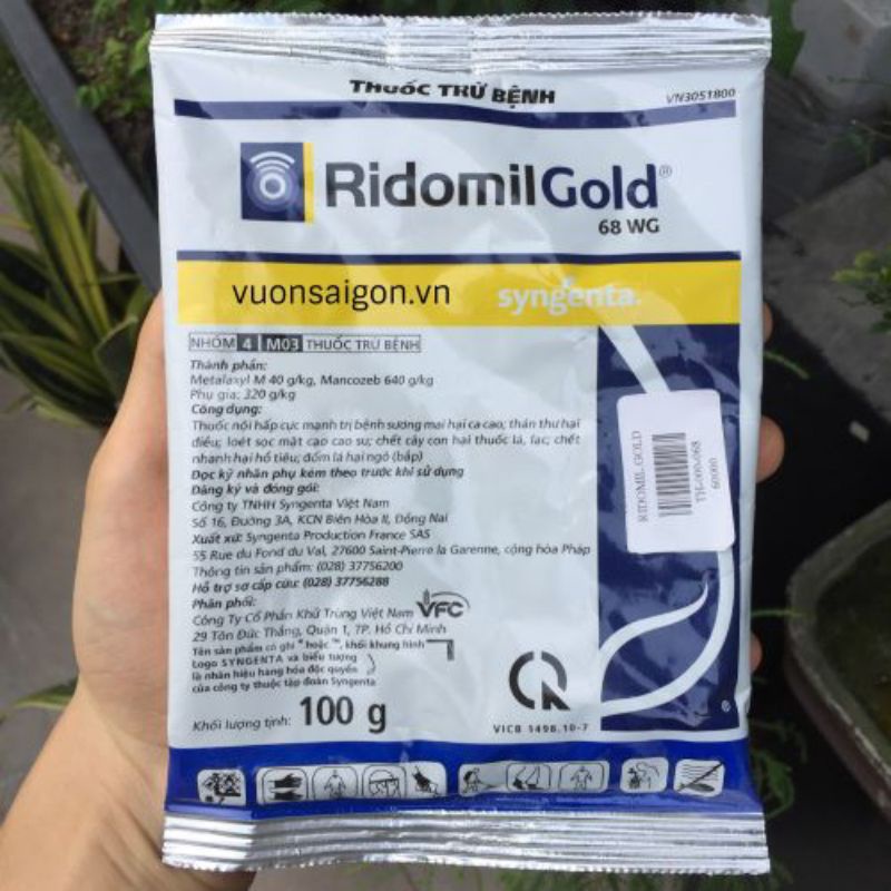 Mô tả: Thuốc trừ bênh Ridomil gold chứa hoạt chất Metalaxy và Mancozeb với hoạt lực tối ưu và hiệu quả. Tiêu diệt hoàn toàn nấm bệnh, phục hồi cây trồng hiệu quả. Quy cách đóng gói: 100gr Hoạt chất: Metalaxy M 40g/kg + Mancozeb 640G/KG Dạng thuốc: dạng cốm (WG) Đặc tính: Tác dụng tiếp xúc, lưu dẫn mạnh, hấp thu nhanh và lưu chuyển tới khắp các bộ phận, nhanh chóng bảo vệ cây trồng 30 phút sau khi phun thuốc. Ưu điểm: Nhờ có hai họat chất hổ trợ nhau nên phòng trừ được nhiều lọai bệnh cây. Cách sử dụng linh hoạt như phun trên lá, quét lên vết bệnh,... Hiệu quả trừ bệnh cao, bảo vệ toàn diện cây trồng, ngay cả những phần non mới mọc sau khi phun Không bụi, an toàn cho người sử dụng: thuốc tan đều và nhanh hơn trong nước. Tính lưu dẫn mạnh giúp bảo vệ tốt nhất bên trong lẫn bên ngoài cây trồng. Hấp thu nhanh nên hạn chế rửa trôi khi trời mưa. Hoàn toàn an toàn cho cây trồng, ít nhạy cảm ở giai đoạn cây ra hoa. Công dụng: Thuốc nội hấp cự mạnh trị vàng lá (chín sớm) hại lúa;sương mai hại cà chua, dưa hấu, vải thiều; thán thư hại xoài, điều; xì mủ cam; loét sọc mặt cạo cao su; chết cây con hại thuốc lá, lạc; thối nõn hại dứa; mốc sương hại nho; đốm cành hại thanh long; đốm lá hại ngôGiá QQQon