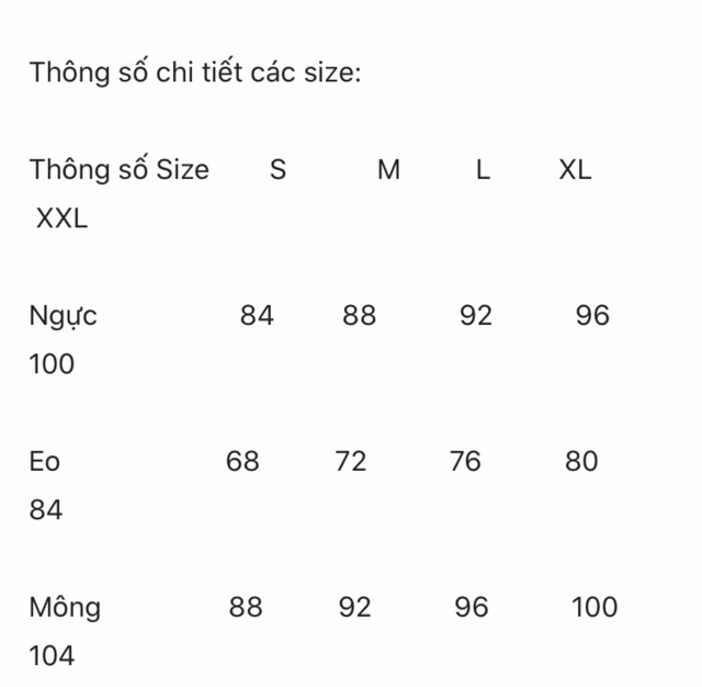 2XL: Ngực 98cm, eo 82cm, mông 102cm