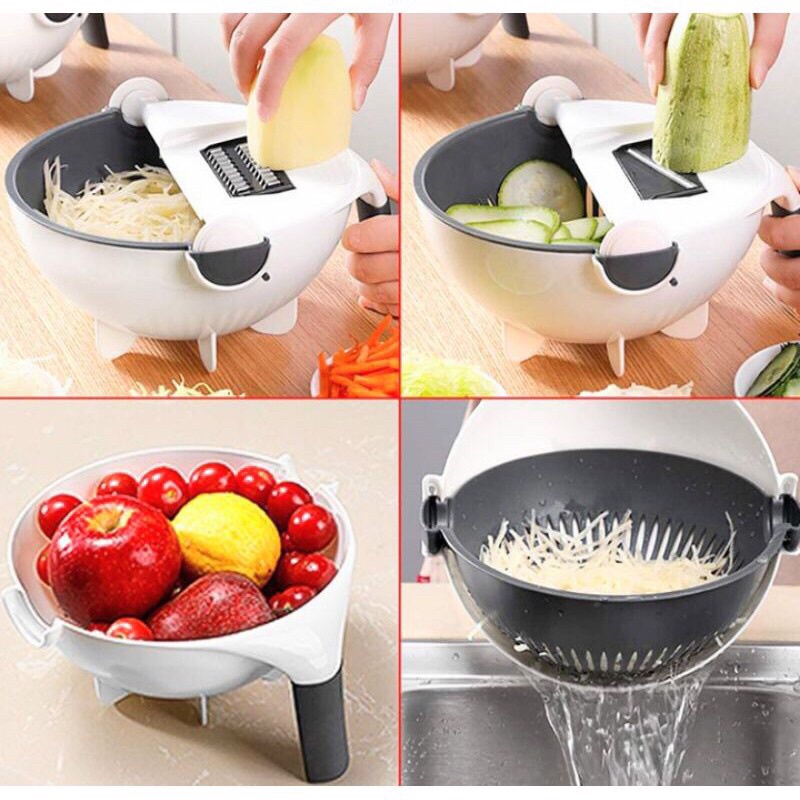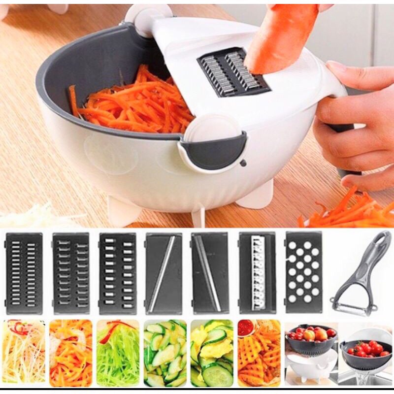 Bộ Dụng Cụ Thông Minh Nạo Rau - Củ - Quả Kèm Rổ 9 Trong 1 Đa Năng- Bộ Dụng Cụ Thông Minh Nạo Rau - Củ - Quả Kèm Rổ 9 Trong 1 Đa Năng thiết kế thông minh, nhỏ gọn và nhiều chức năng với cấu tạo gồm: lưỡi gọt (nạo) vỏ củ quả (củ khoai tây, bầu, bí, cà rốt, mướp, susu…); lưỡi bào (cắt) củ quả thành sợt nhỏ (Bào cà rốt, đu đủ, dừa…); rổ hứng rửa xoay 360 độ không lo bị rơi ra ngoài… giúp việc chế biến các món ăn thật đơn giản và dễ dàng và đẹp mắt.