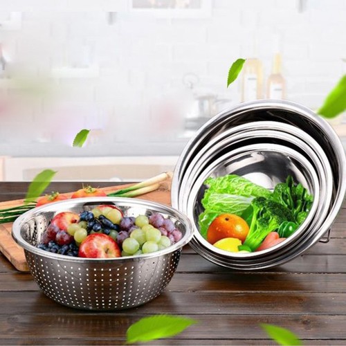 Bộ rổ chậu inox 18cm - 26cm cao cấp, đa năngBộ thau rổ Inox không gỉ 5 món tiện dụng-dày dặn thông thoáng-thoát nước nhanh chóng không ám mùi-sang trọng gian bếp