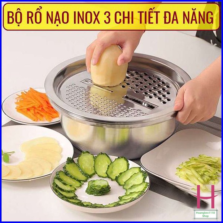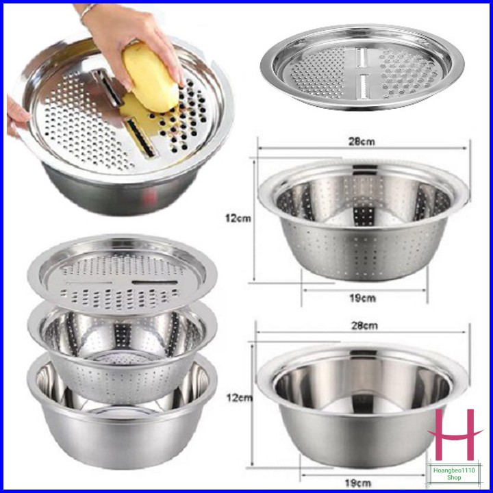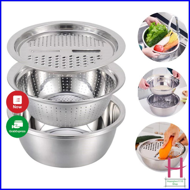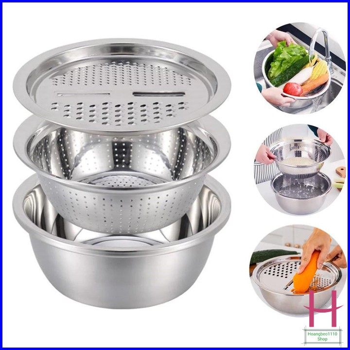 Bộ rổ, chậu kèm nạo rau củ quả inox đa năng 3in1 siêu tiện dụng { H }