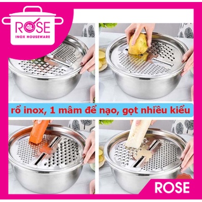 Gia dụng Rose kính chào quý khách chúc quý khách mua sắm vui vẻ dưới đây là mô tả sản phẩm quý khách xem qua để hiểu rõ hơn về sẳn phẩm nhé!!Bộ rổ, chậu kèm nạo rau củ quả inox đa năng 3in1 cao cấp siêu tiện dụng