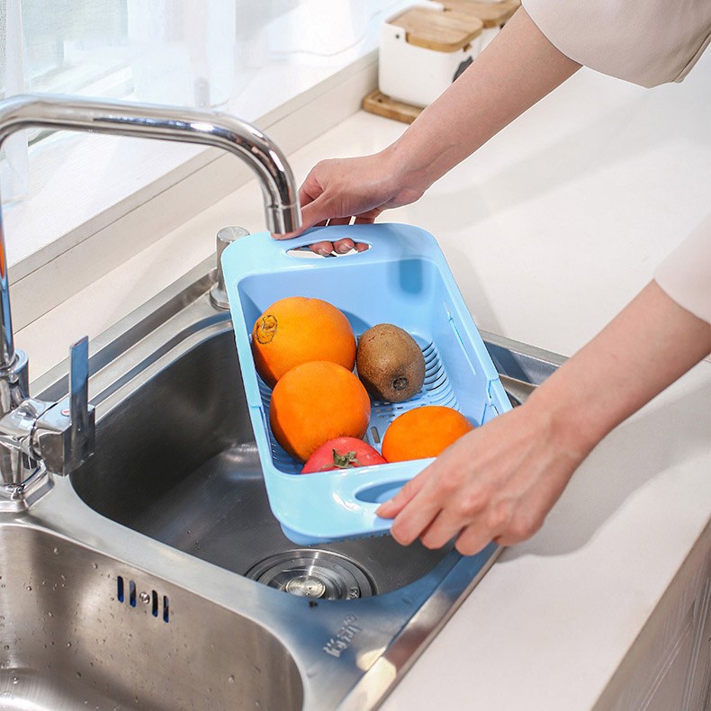 – Rổ gấp gọn gác bồn với thiết kế hình chữ nhật thông minh khi kéo 2 tay cầm ra có thể đặt ngang bồn rửa để hoa quả, rau củ ráo nước rất tiện lợi, tiện dụng với thiết kế đa năng 2 trong 1.