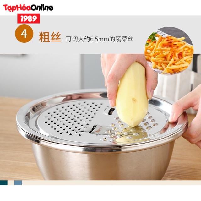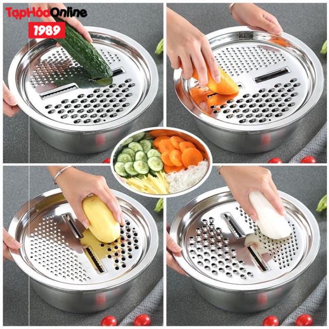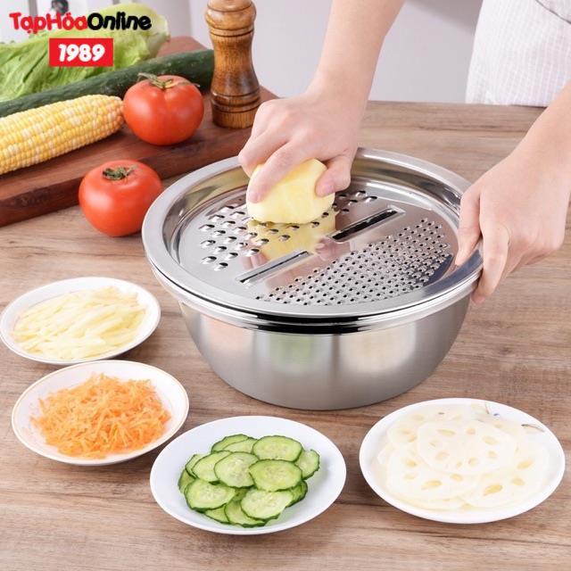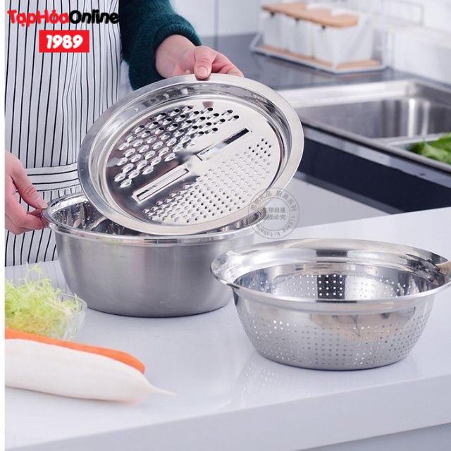 Bộ thau rổ Inox 3 món - Kèm vỉ bào hoa quả, nạo rau củ✅Thiết kế đẹp mắt, sạch sẽ, đa dụng