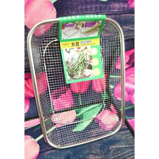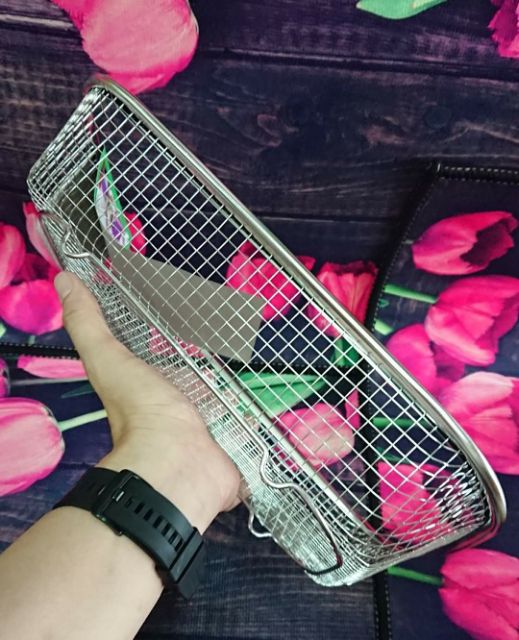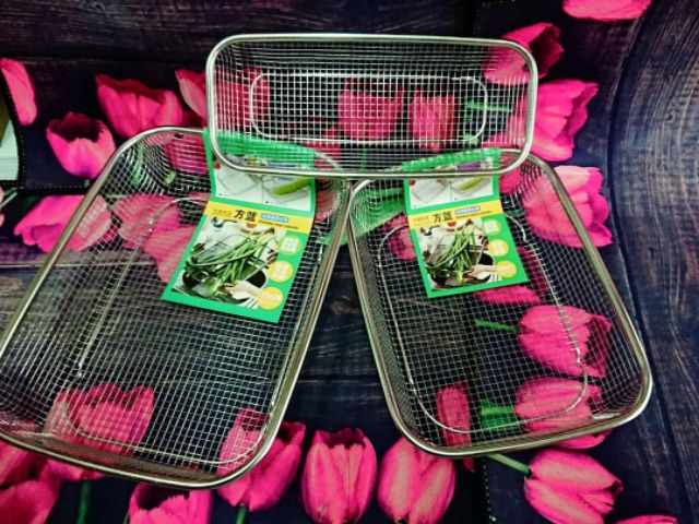 Rổ inox chữ nhậtDùng để vớt đồ chiên cho ráo dầu, dùng để rửa rao củ, trái cây v.v...