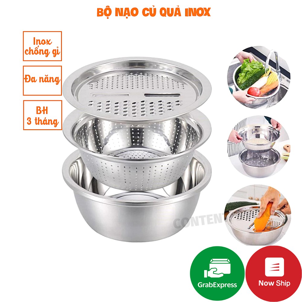 - Bộ bao gồm : 01 Mặt nạo nhiều kiểu, 01 Rổ inox, 01 Chậu inox 100% cao cấp dày dặn