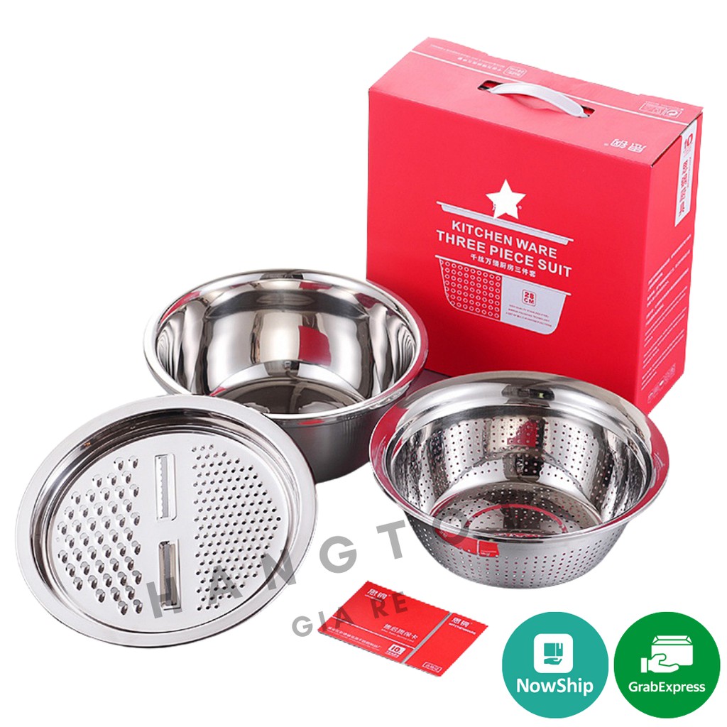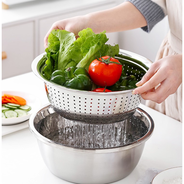 Nhà cửa & Đời sống > Dụng cụ nhà bếp > Bàn nạo, dụng cụ bào, cắt || Bộ Rổ Inox Kèm Nạo Rau Củ Inox 3 Chi Tiết - Rổ Nạo NồiCòn hàng
