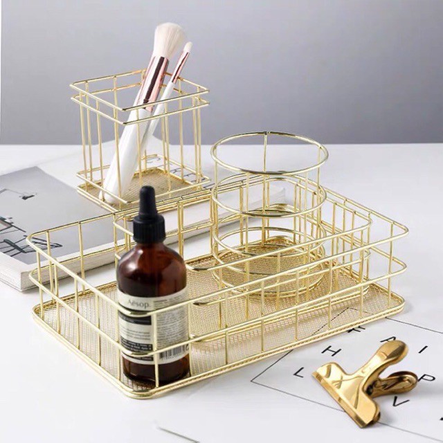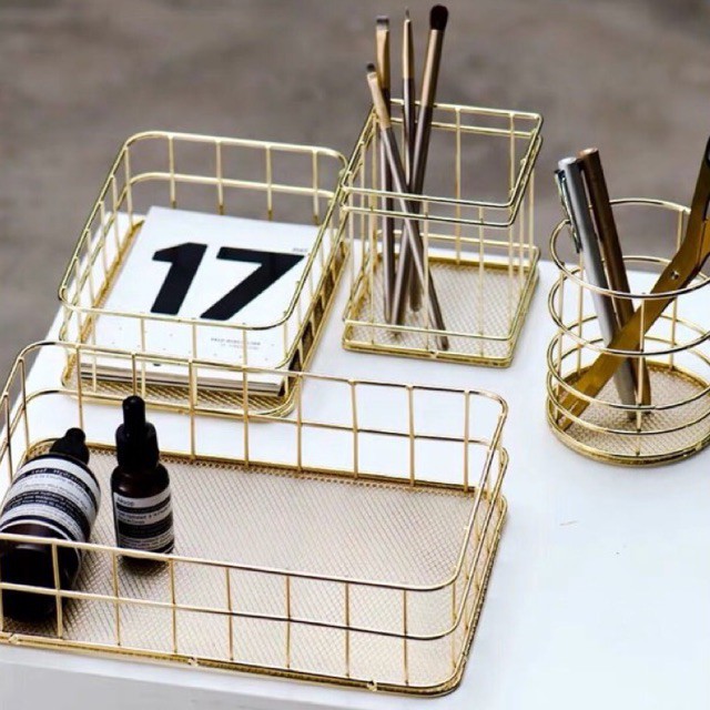 Ngoài rổ / khay kim loại chữ nhật, shop còn có loại khay size A4 và loại ống tròn kim loại chuyên cắm bút / cọ trang điểm / thìa đũa kim loại cùng phong cách ạ. Bạn nào thích style rose gold tinh tế sang trọng này thì đặt mua ngay nha