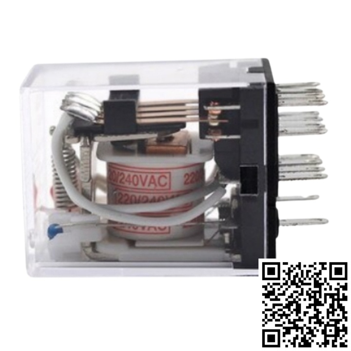 Rơ le trung gian kiếng MY4N-J 14 chân dẹp nhỏ có đèn điện áp 12VDC, 24VDC, 220VAC dùng chân đế PYF14A màu trắng có cuộn coil các models AC và DC khác nhau giúp phân biệt dễ dàng hơn.