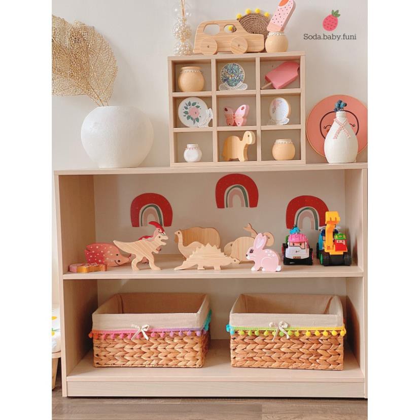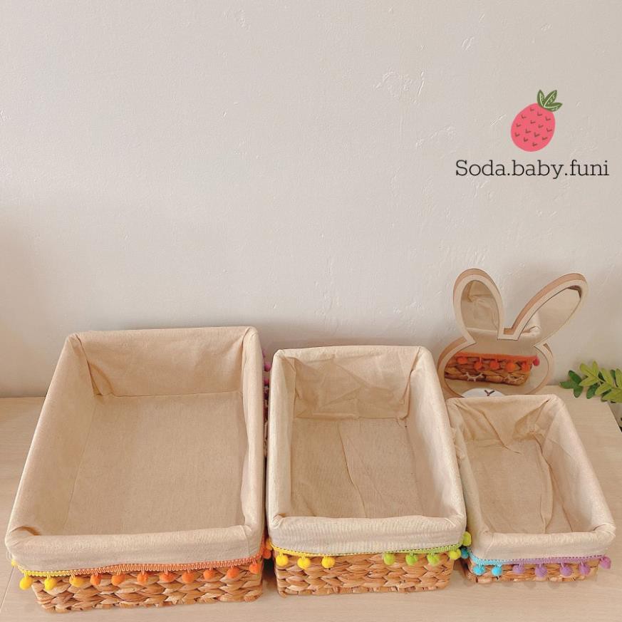 .. Rổ lục bình / sọt mây chữ nhật viền bombom màu hồng trắng xanh kích thước 20-25cm mã 001