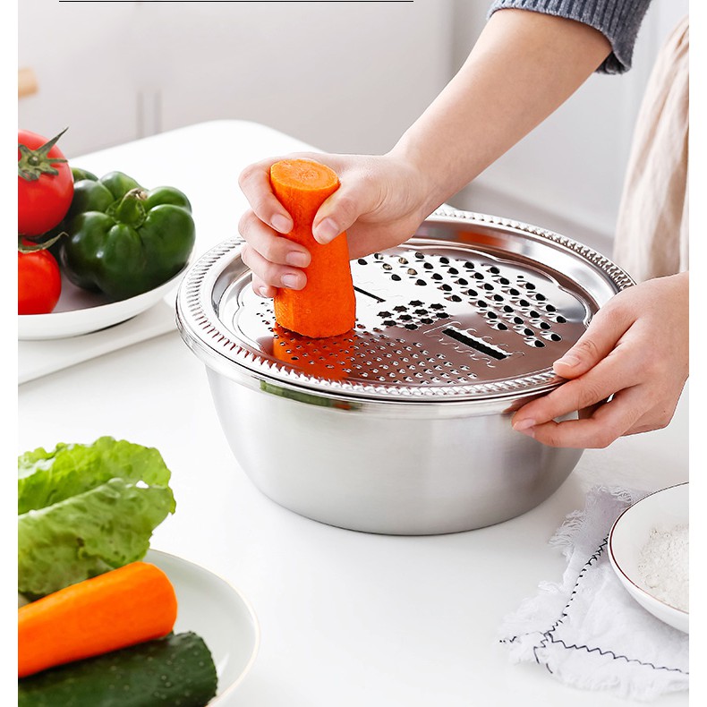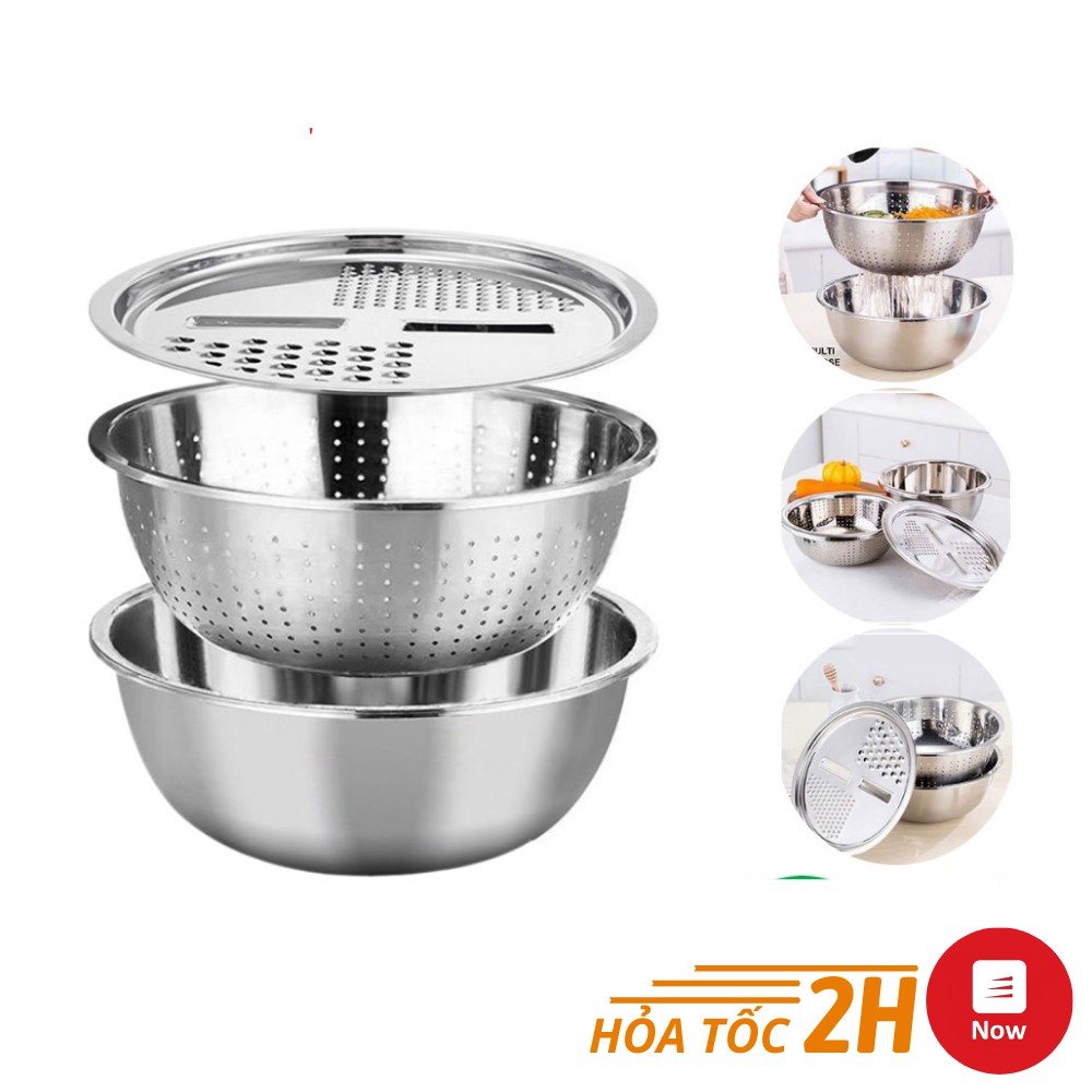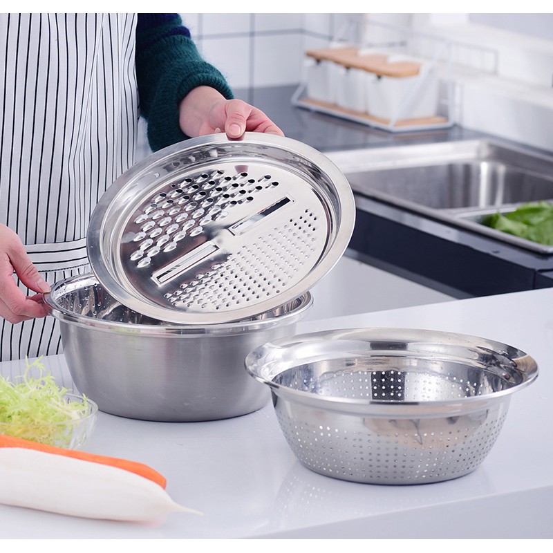 Nhà cửa & Đời sống > Dụng cụ nhà bếp > Bàn nạo, dụng cụ bào, cắt || Bộ Rổ Nạo Inox 3 Chi Tiết Kèm Chậu Đa Năng Bộ Bát Trộn Rau Củ Quả Inox Kèm Nạo Đa NăngCòn hàng