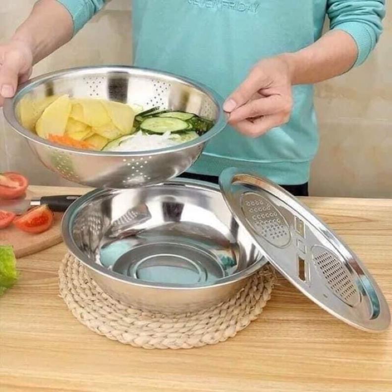 Bộ Rổ Nạo Inox Đa Năng 3 in 1, Dụng Cụ Bào Sợi Rau Củ Thau, Rổ, Nạo Inox Tiện Lợi Cho Công Việc Làm Bếp