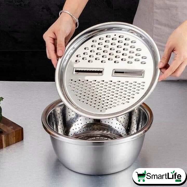 Rổ nạo inox, bộ 3 dụng cụ bào rau củ, gọt rau củ (rau + rổ + mặt bào) Kitchen inox 304 không rỉ có thau đựng.➡ Sản phẩm Thau inox 3 món đa năng