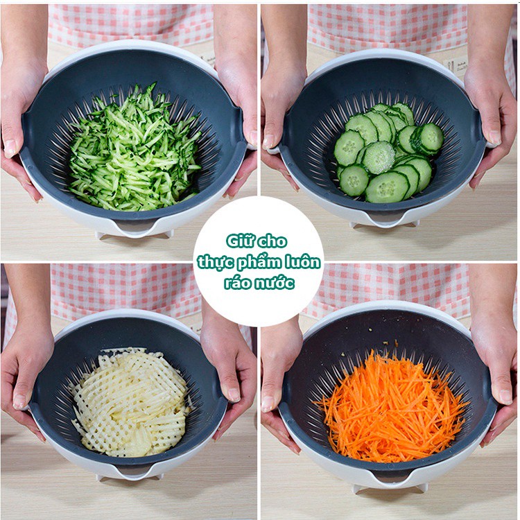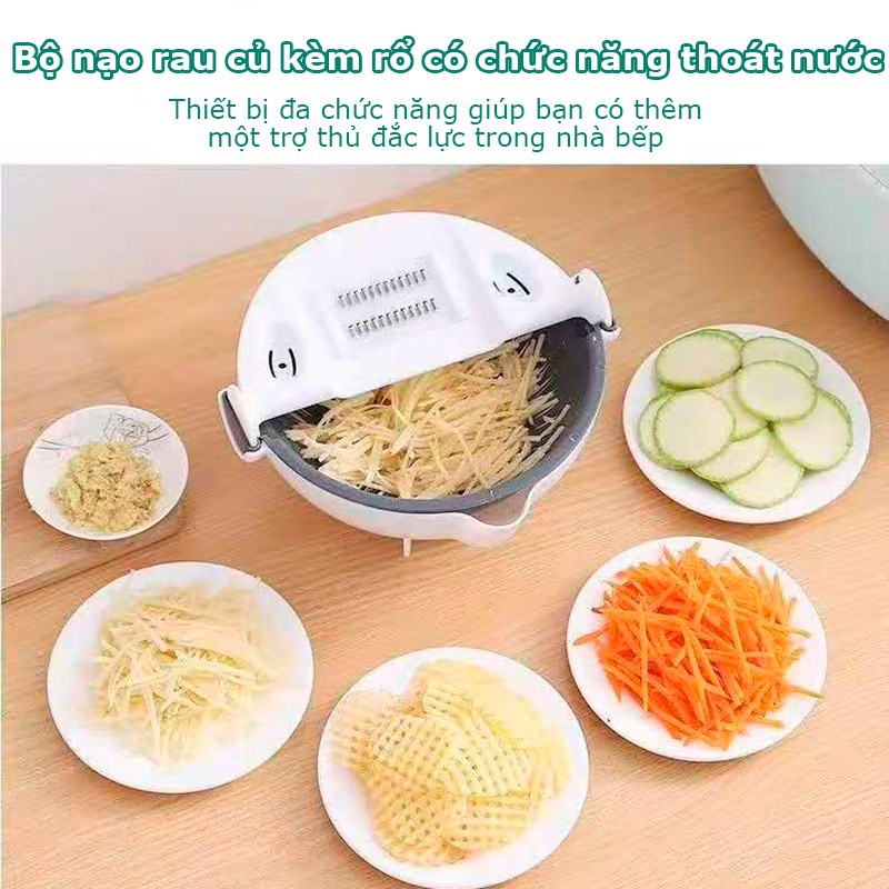 🍄Bộ Dụng Cụ Thông Minh Nạo Rau - Củ - Quả Kèm Rổ 9 Trong 1 Đa Năng thiết kế thông minh, nhỏ gọn và nhiều chức năng với cấu tạo gồm: lưỡi gọt (nạo) vỏ củ quả (củ khoai tây, bầu, bí, cà rốt, mướp, susu…); lưỡi bào (cắt) củ quả thành sợt nhỏ (Bào cà rốt, đu đủ, dừa…); rổ hứng rửa xoay 360 độ không lo bị rơi ra ngoài… giúp việc chế biến các món ăn thật đơn giản và dễ dàng và đẹp mắt.- Tay cầm bằng nhựa chất lượng cao, giúp sản phẩm chắc chắn và rất bền, an toàn, dễ cầm, dễ sử dụng. Với dụng cụ nạo gọt củ quả đa năng kèm rổ bạn có thể bào nhỏ, bào sợi, nạo và rửa ngay với rổ… các loại rau củ quả theo nhu cầu chế biến món ăn. Hỗ trợ cho công việc nội trợ của bạn một cách tối đa.