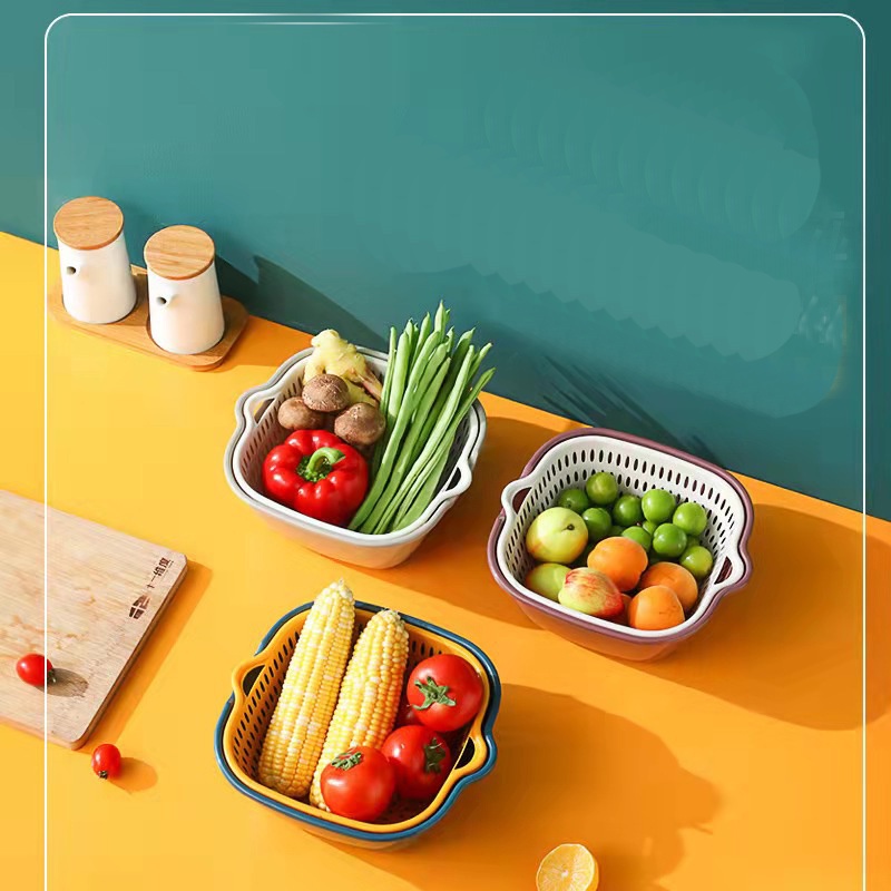 - Rổ nhựa chữ nhật kèm chậu kết hợp 2 loại rổ thành một đôi, một chiếc có công dụng để ráo, 1 chiếc để đựng nước, mang lại hiệu quả mỗi khi ngâm, rửa