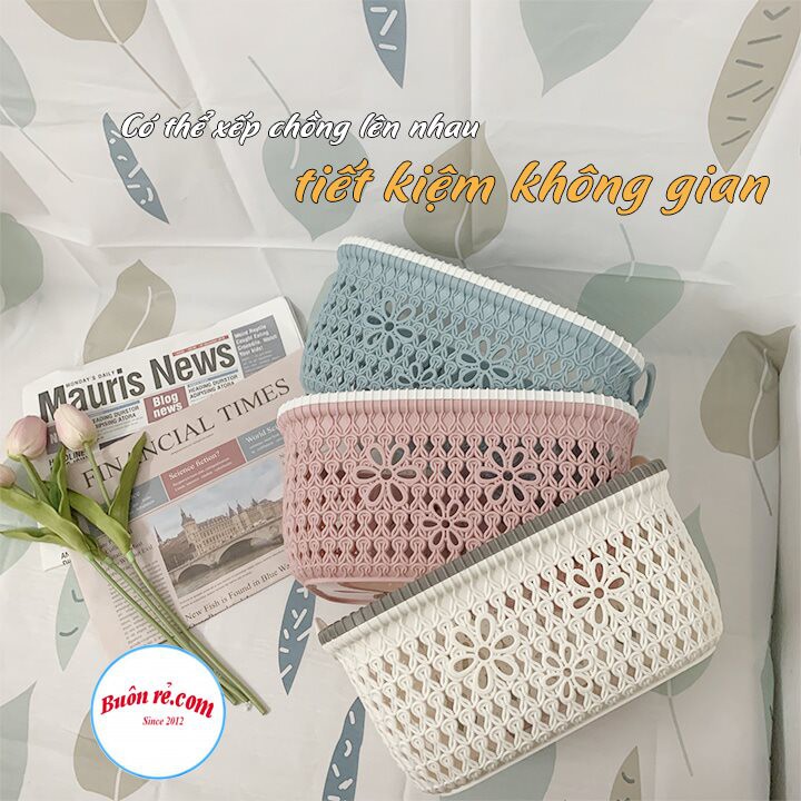 - Giỏ nhựa hoa VIỆT NHẬT có quai cầm được thiết kế giả đan mây điểm xuyết những bông hoa xinh, lỗ nhỏ, giúp bạn để được những vật nhỏ mà không bị rơt rớt