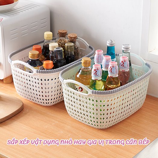 Rổ Nhựa Giả Đan Mây Có Quai Cầm được thiết kế giả đan mây , lỗ nhỏ, giúp bạn để được những vật nhỏ mà không bị rơt rớt